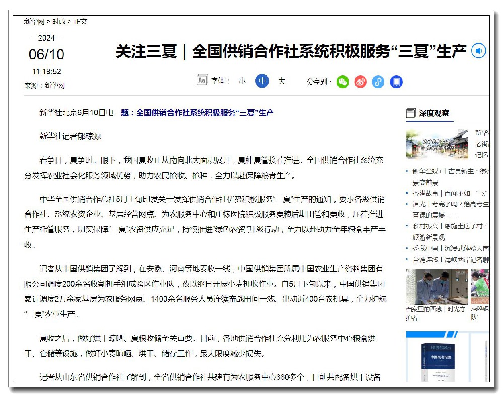 新华社北京6月10日电 题:全国供销合作社系统积极服务“三夏”生产